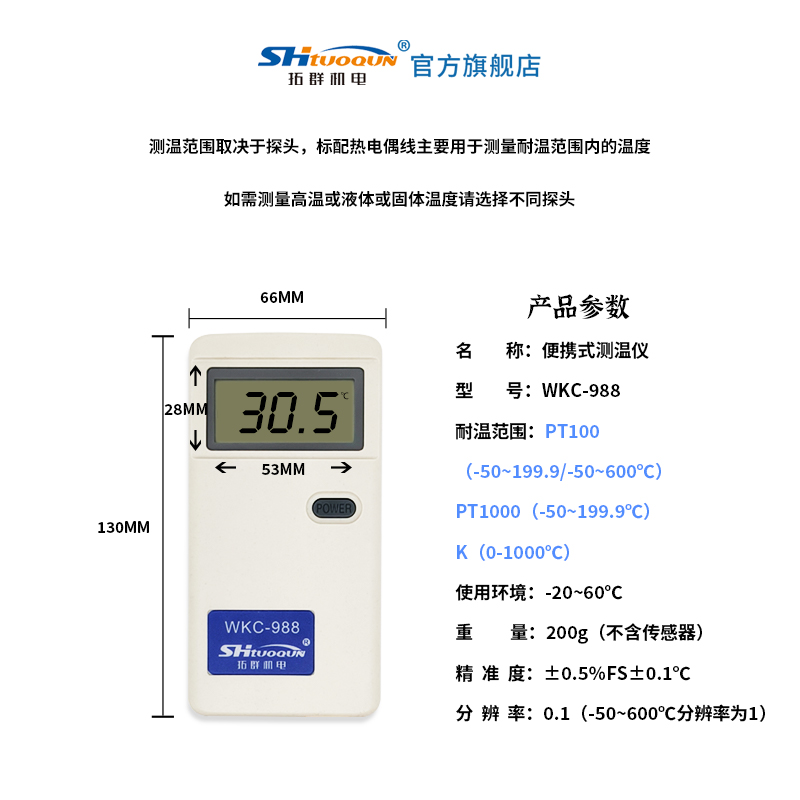 拓群機(jī)電pt100/wkC一988是上海拓群機(jī)電設(shè)備有限公司推出的一款性價(jià)比極高的鉑電阻溫度測試儀,這款測溫儀目前也存在著已知的一些小問題,2線制的接線方式方便使用,但是無法消除線阻,測試出的溫度會比實(shí)際溫度偏高,同一條件下線越長,溫度偏高越多,后期我們會推出更多優(yōu)質(zhì)的鉑電阻溫度測試儀,盡請期待!